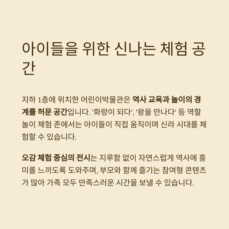 어린이박물관에서 시작해 국보 유물 관람, 굿즈 구매까지 하루 종일 알차게 보낼 수 있는 실내 명소로, 경주 여행의 핵심 볼거리이자 교육적 가치까지 담긴 장소입니다.