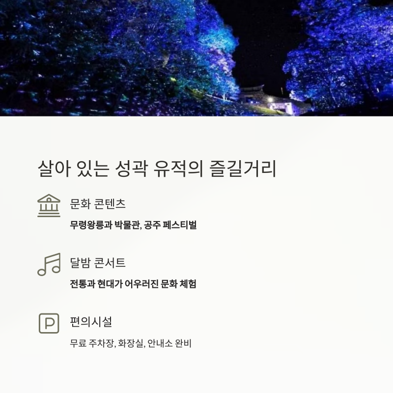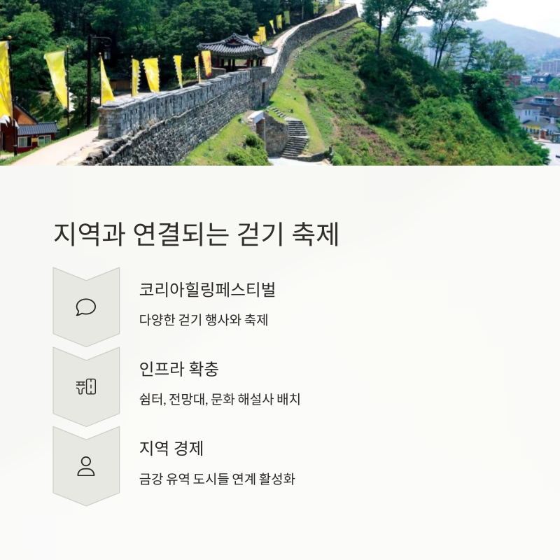 | 콘텐츠 | 역사 해설, 야간 콘서트, 사계절 축제 | 걷기 대회, 힐링 쉼터, 출사지 |