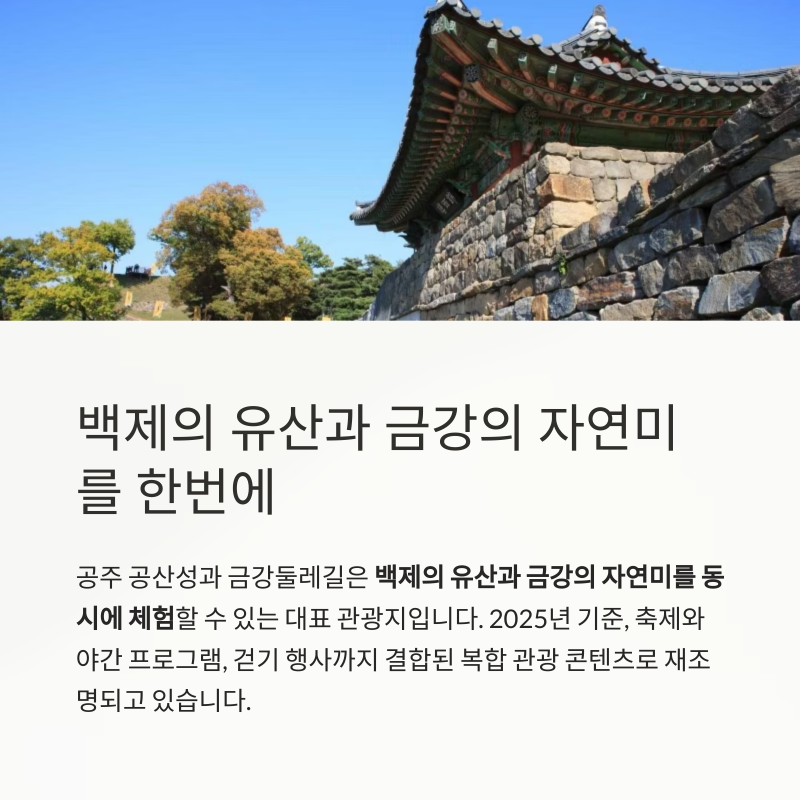 공산성과 금강둘레길은 단순한 유적지나 산책로가 아닌, 스토리텔링과 콘텐츠가 살아있는 문화관광지로 진화하고 있습니다.