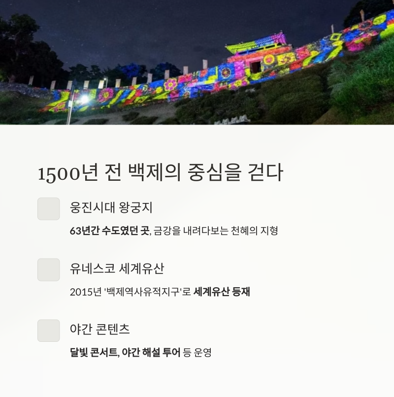 과거 백제의 숨결과 현재의 힐링 트렌드를 동시에 담아낸 이 두 명소는 공주의 미래형 관광을 대표하는 핵심 자산입니다.