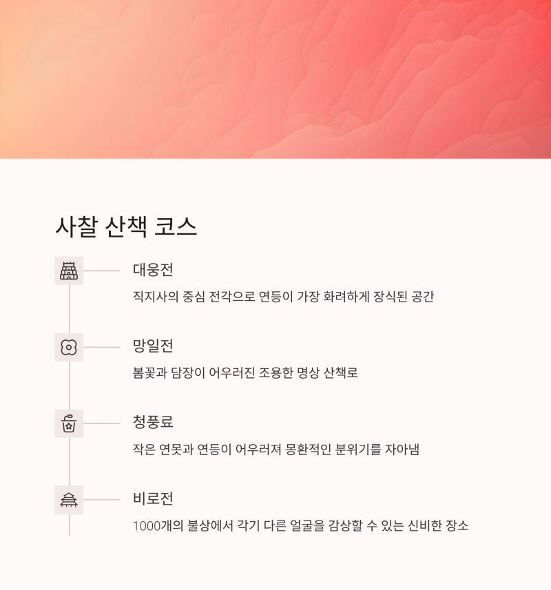 | 비로전 | 1000개의 불상에서 각기 다른 얼굴을 감상할 수 있는 신비한 장소 |