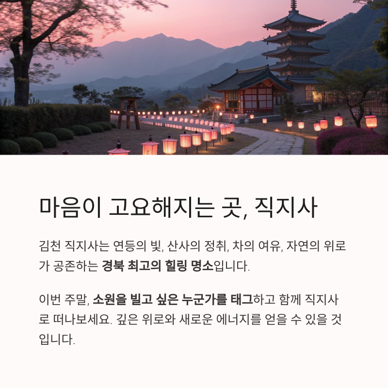 김천 직지사는 연등의 빛, 산사의 정취, 차의 여유, 자연의 위로가 공존하는 경북 최고의 힐링 명소입니다.
