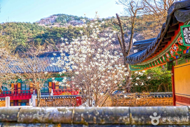 | 망일전 | 봄꽃과 담장이 어우러진 조용한 명상 산책로 |