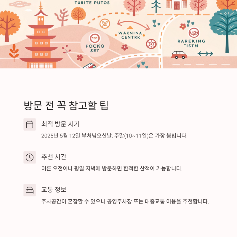 편안한 운동화와 바람막이 겉옷을 준비하면 경내 산책과 인근 자연 탐방에 도움이 됩니다.