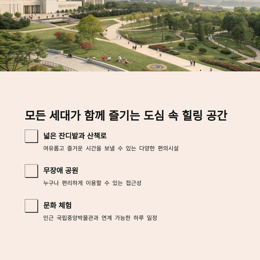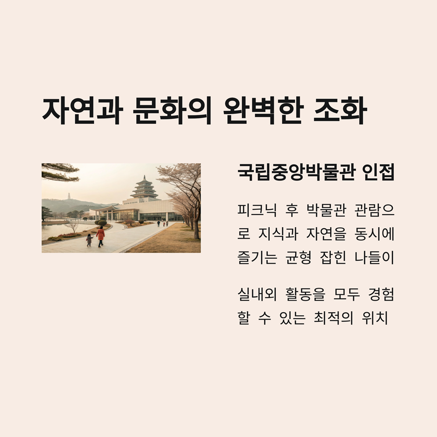 인근 국립중앙박물관에서 문화 체험까지 연계 가능해 하루 일정이 꽉 찬 만족감을 선사합니다.