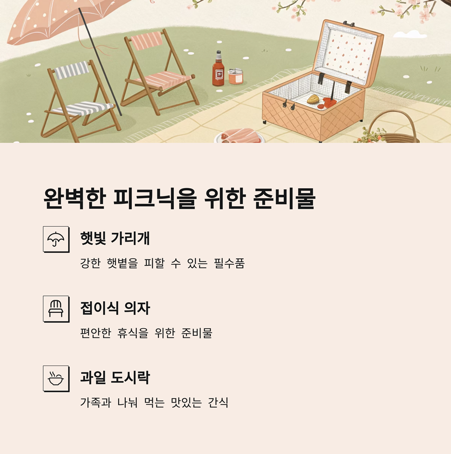 햇빛 가리개, 접이식 의자, 과일 도시락 등을 미리 준비하는 것을 추천합니다.