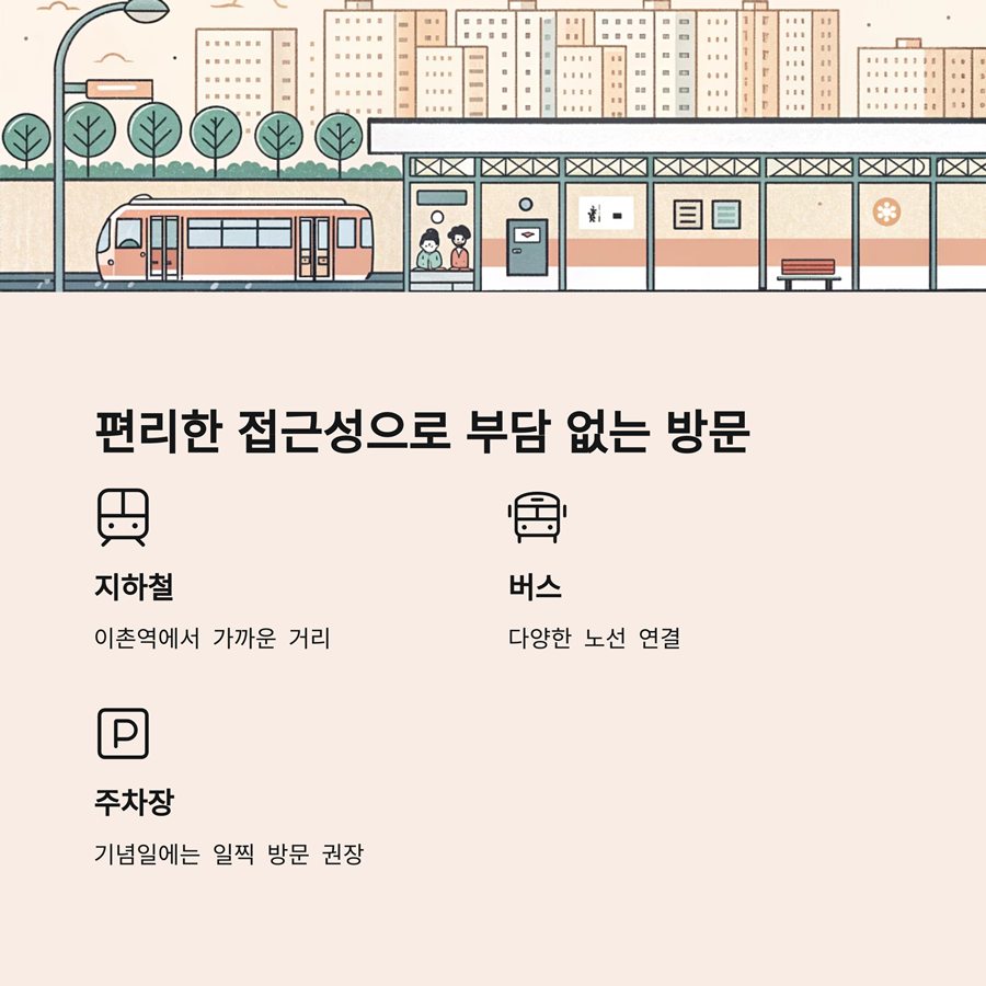 공원 인근에 주차장이 마련되어 있어 자가용을 이용한 방문도 무리가 없습니다.