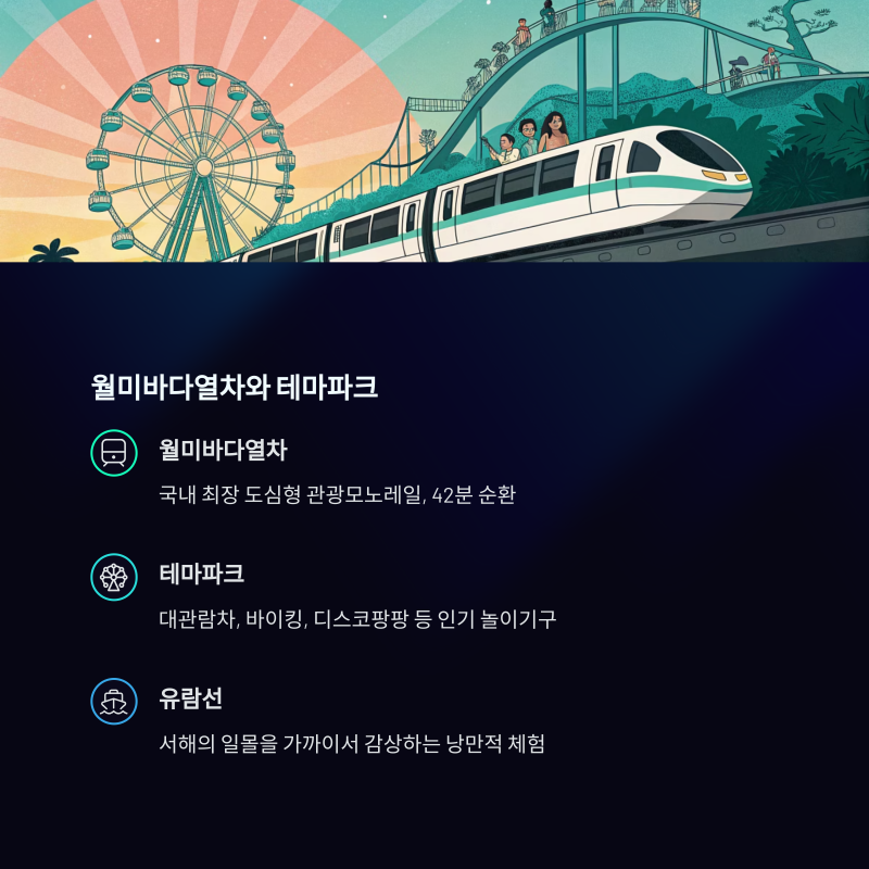 국내 최장 도심형 관광모노레일인 월미바다열차는 약 42분 동안 월미도 일대를 순환하며 풍경을 감상할 수 있습니다.