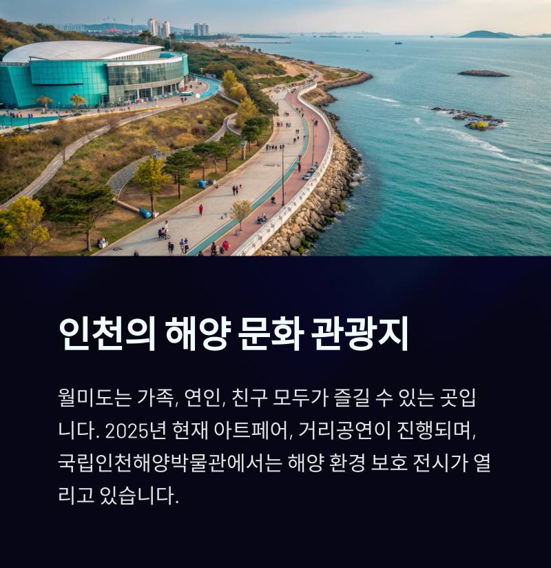 월미도 문화거리와 국립인천해양박물관은 예술, 체험, 교육, 놀이가 공존하는 복합 해양 공간으로, 지역 예술가의 창작 활동과 시민 참여형 프로그램을 통해 2025년에도 인천을 대표하는 문화 명소로 자리매김하고 있습니다.