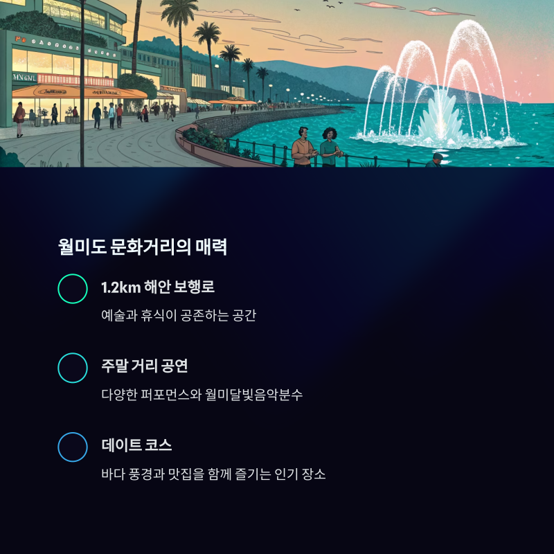 주말마다 열리는 거리 공연과 퍼포먼스, 그리고 바다와 어우러진 월미달빛음악분수는 방문객에게 잊지 못할 경험을 선사합니다.