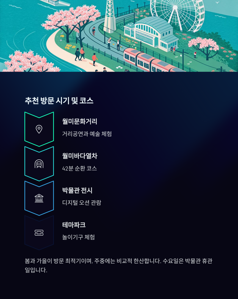월미문화거리 → 월미바다열차 → 박물관 전시 → 테마파크 순으로 이동하면 당일 코스로도 알차게 여행이 가능합니다.