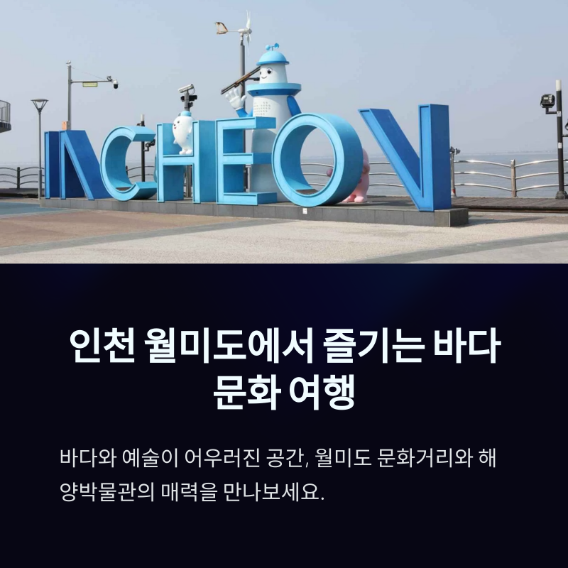 인천 월미도는 가족, 연인, 친구 모두가 함께 즐길 수 있는 해양 문화 관광지입니다.