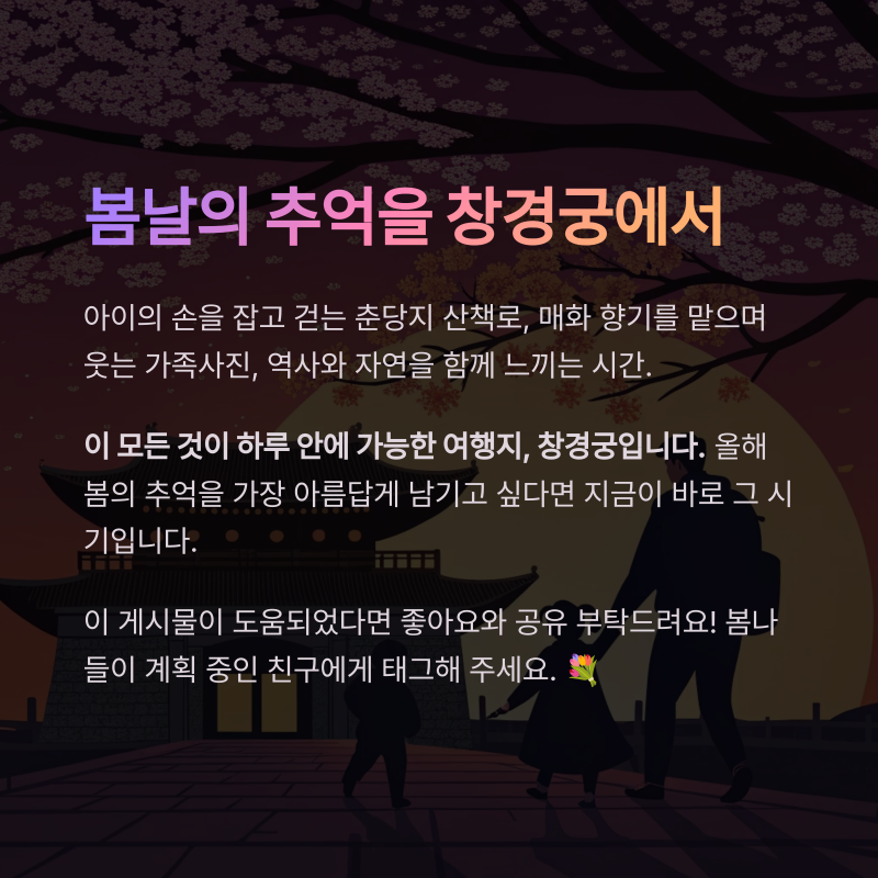 아이의 손을 잡고 걷는 춘당지 산책로 매화 향기를 맡으며 웃는 가족사진 역사를 배우며 자연을 느끼는 해설 프로그램 이 모든 것이 하루 안에 가능한 여행지, 창경궁입니다.