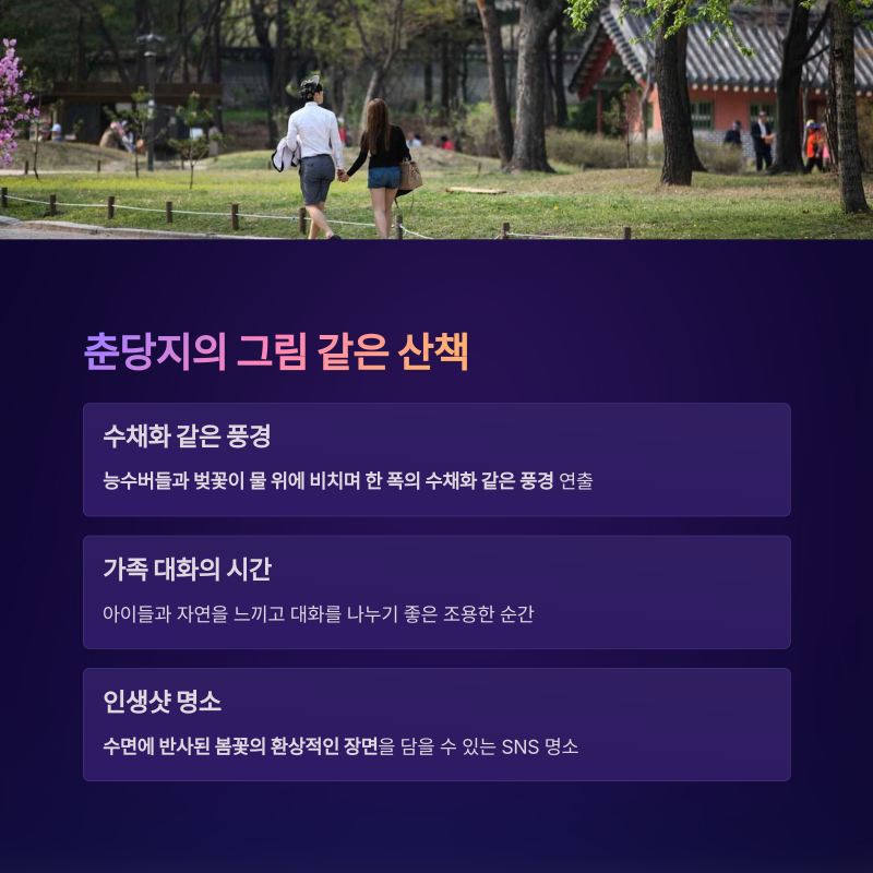 궁 안 연못인 춘당지 주변은 능수버들과 벚꽃이 물 위에 비치며 한 폭의 수채화를 연상시키는 풍경을 자아냅니다.