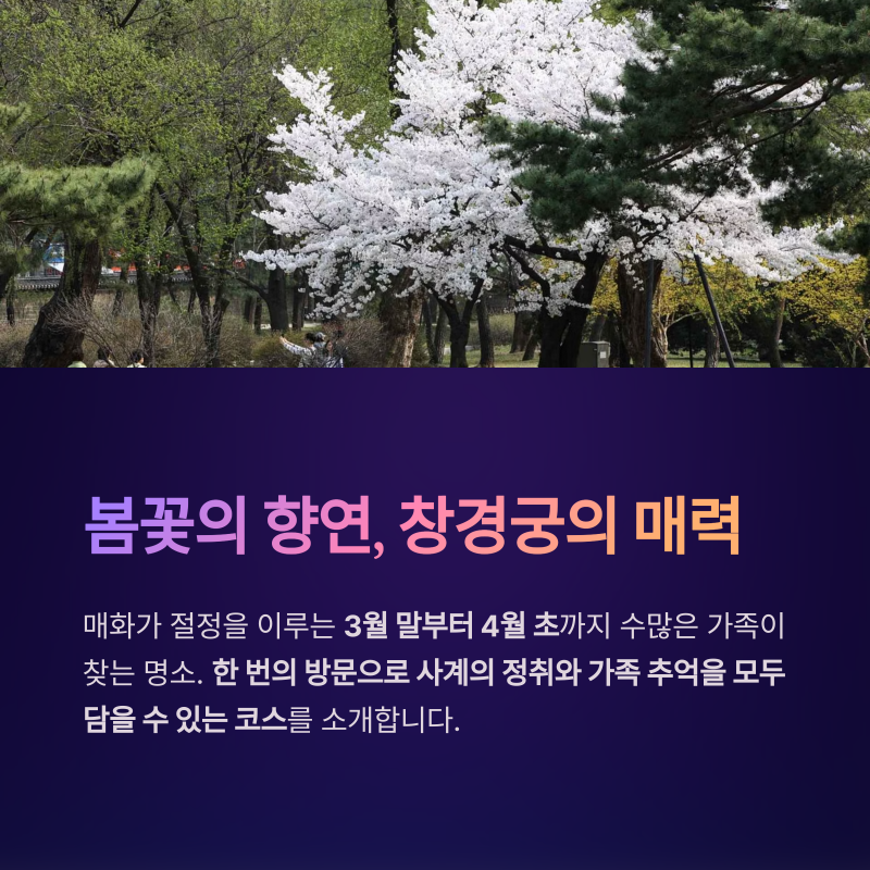 아이의 손을 잡고 걷는 춘당지 산책로 매화 향기를 맡으며 웃는 가족사진 역사를 배우며 자연을 느끼는 해설 프로그램 이 모든 것이 하루 안에 가능한 여행지, 창경궁입니다.