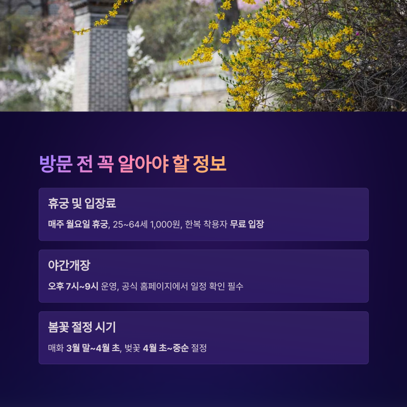 특히 입구에서 만나는 매화나무 군락은 "서울 도심에서 가장 아름다운 매화 명소"로 손꼽히며, 한복을 입고 가족사진을 찍기에도 최적의 장소입니다.