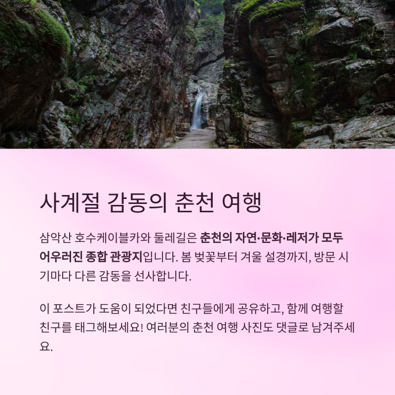 삼악산 호수케이블카와 둘레길은 춘천의 자연·문화·레저가 모두 어우러진 종합 관광지입니다.
