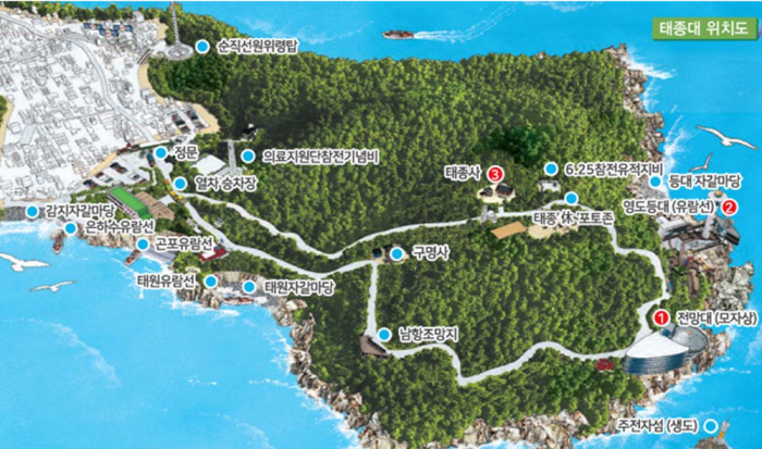 • 승차장(출발지) → 전망대 → 영도등대 → 태종사 → 승차장