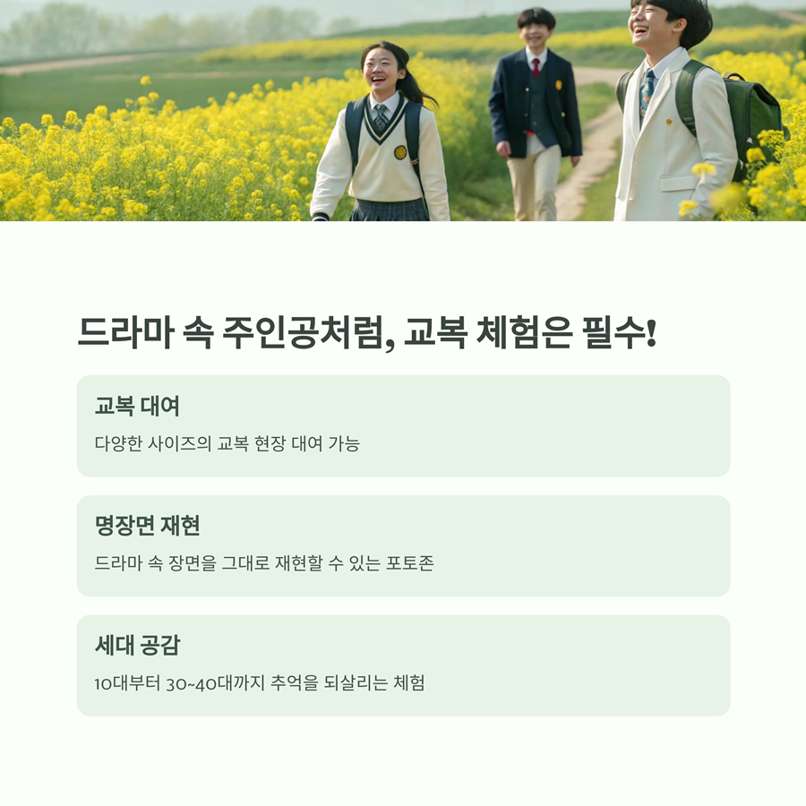 현장에서는 다양한 사이즈의 교복이 대여 가능하며, 포토존 곳곳에는 드라마 명장면을 재현할 수 있도록 꾸며져 있습니다.