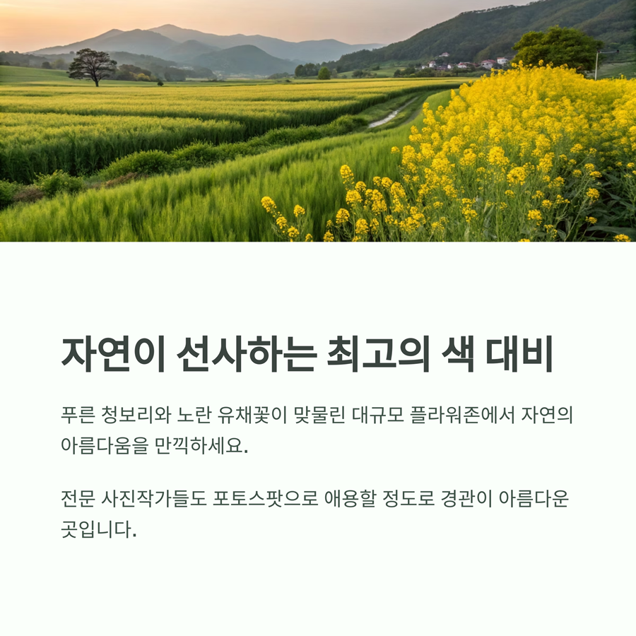 특히 2025년 4월 19일부터 5월 11일까지 진행되는 청보리밭 축제 기간에는 유채꽃과 청보리의 조화 속에서 색다른 힐링을 경험할 수 있습니다.