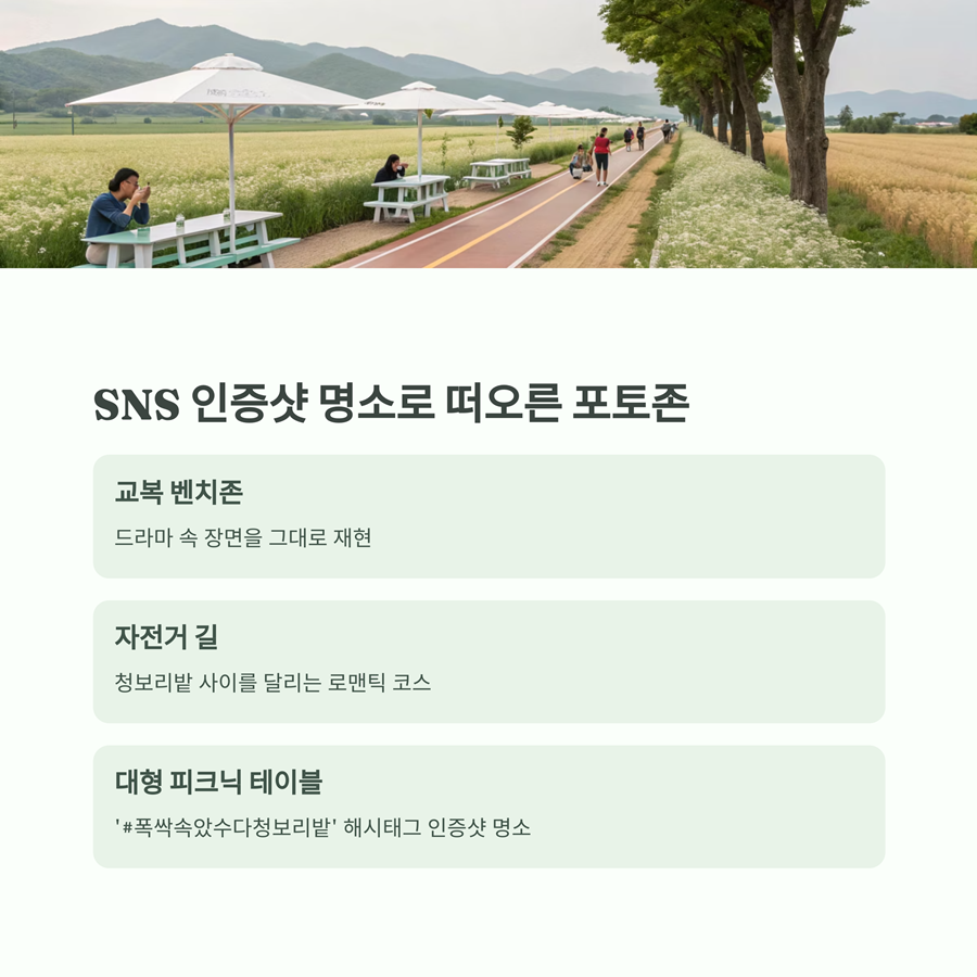 많은 방문객이 SNS에 ‘#폭싹속았수다청보리밭’ 해시태그를 달며 실시간 인증샷을 올리는 명소로 기능하고 있습니다.