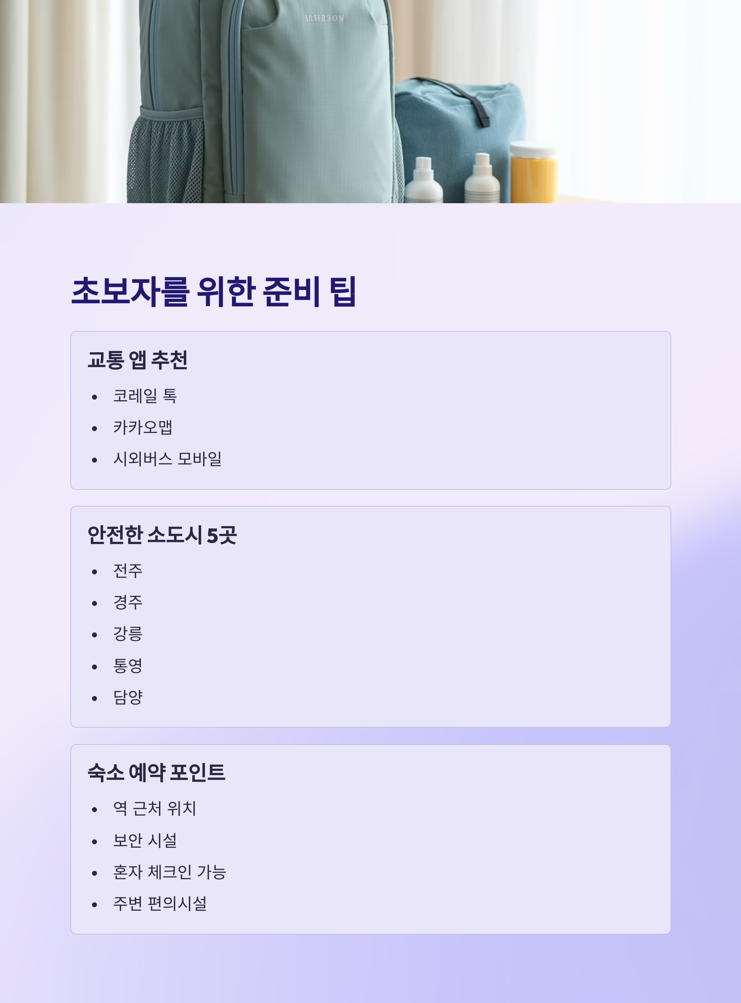 | 혼자 여행 시 꿀팁 | 교통편, 숙소 미리 예약하면 걱정 없어요 |