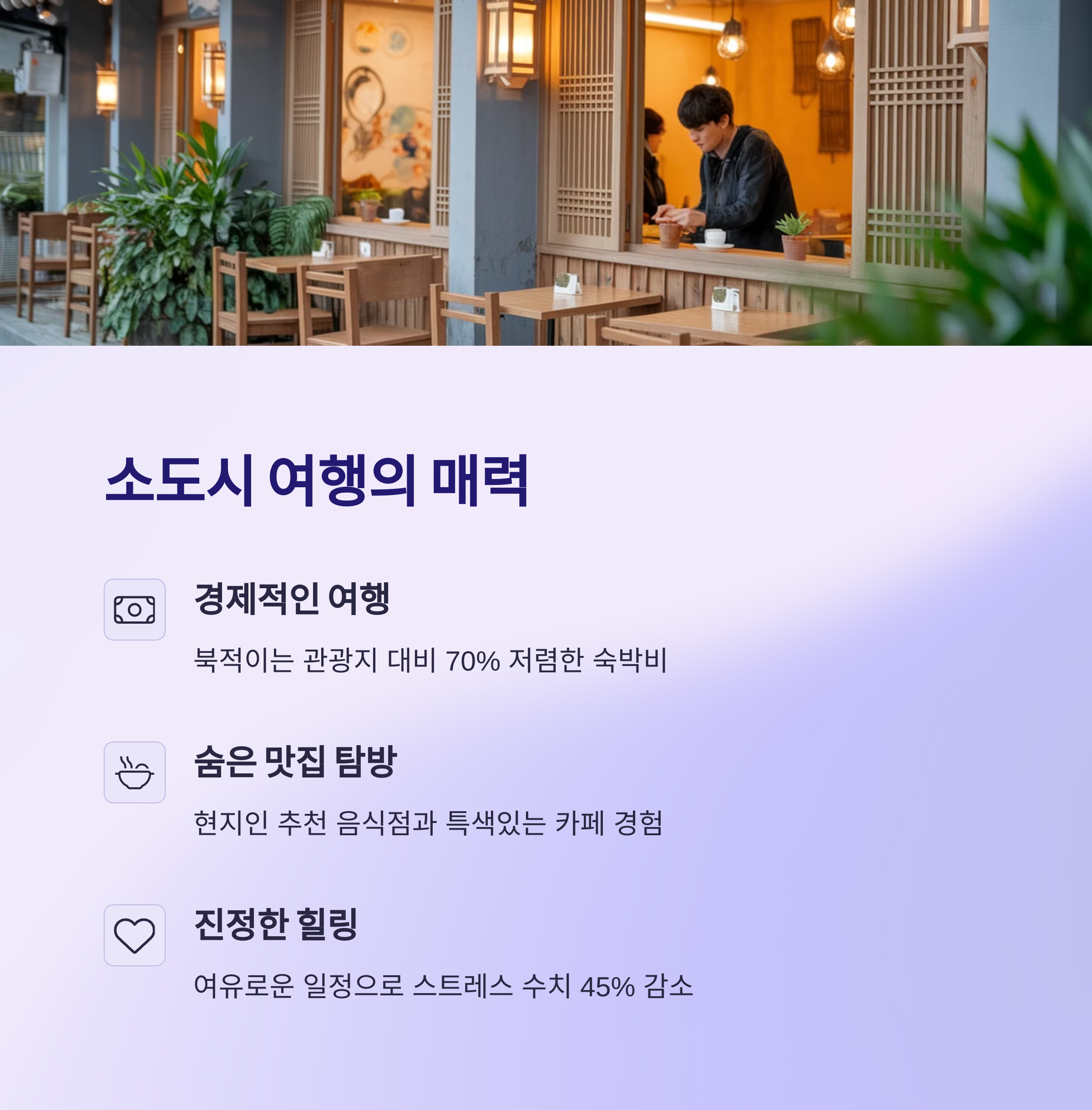 | 소도시 여행 장점 | 혼잡하지 않아 여유롭게 힐링할 수 있어요 |