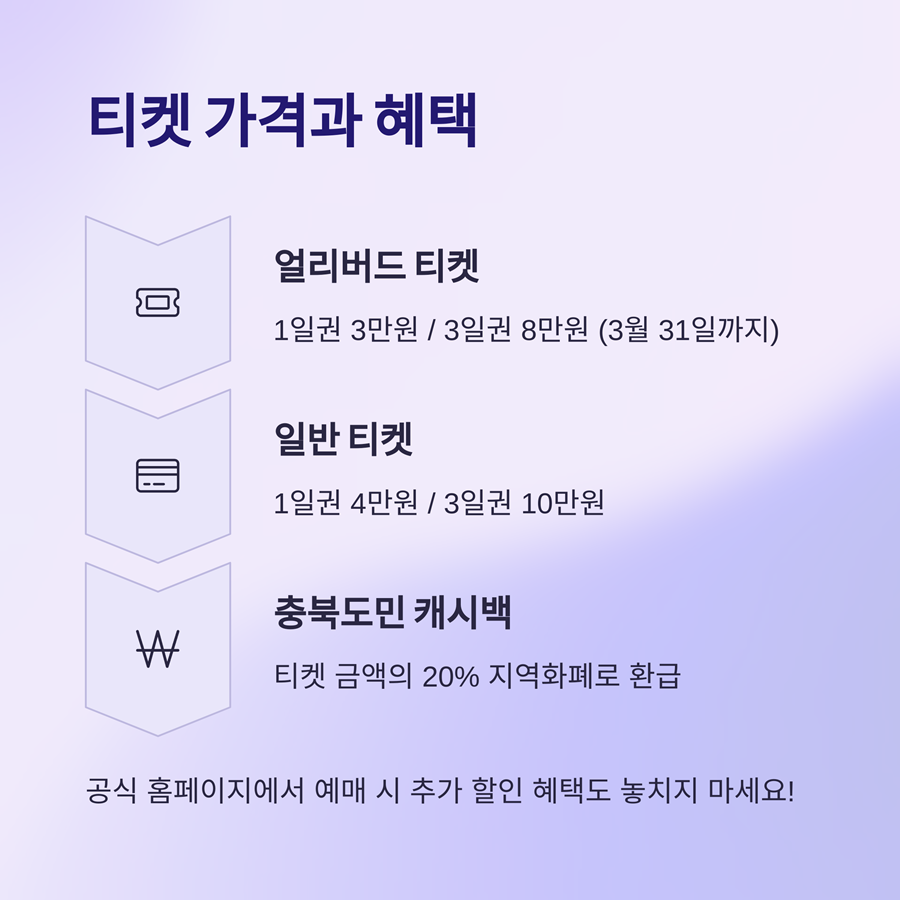 티켓 가격과 혜택 - 얼리버드와 충북도민 캐시백 정보