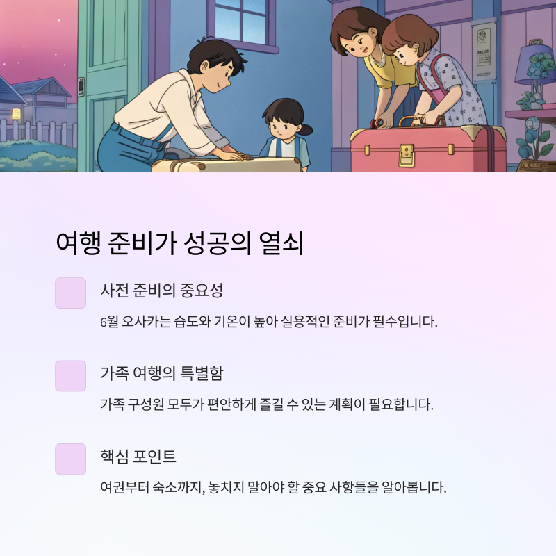 특히 6월은 습도와 기온이 높아지는 시기로, 여행 중 불편을 최소화할 수 있는 실용적인 준비가 필요합니다. 본문에서는 여권부터 여행자 보험, 숙소 추천까지 6월 오사카 가족여행을 위한 핵심 포인트를 모두 다룹니다.