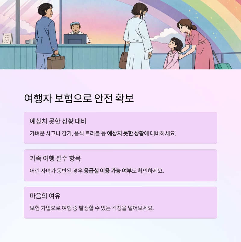 가벼운 사고나 감기, 음식 트러블 등 예상치 못한 상황을 대비하기 위해 여행자 보험은 꼭 가입하는 것이 좋습니다. 특히 어린 자녀가 동반된 가족 여행이라면 응급실 이용 가능 여부도 보험 항목에서 확인하세요.