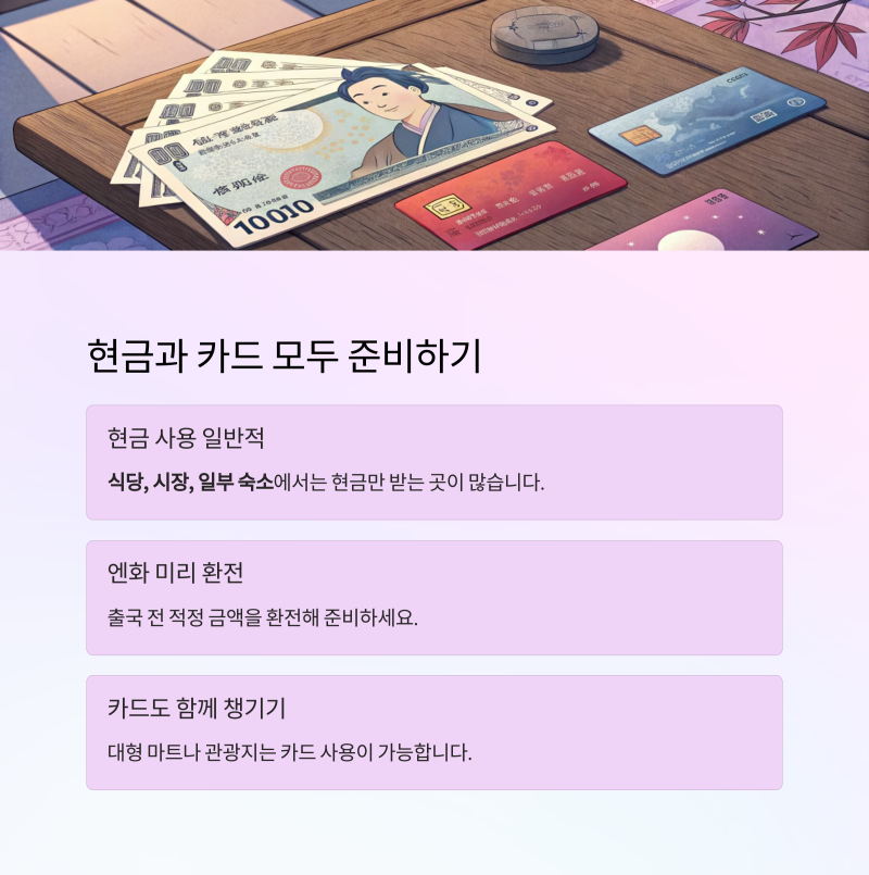 식당, 시장, 일부 숙소에서는 현금만 받는 곳도 많기 때문에 엔화로 미리 환전하는 것이 좋습니다. 다만 대형 마트나 관광지는 카드 사용이 가능하므로 신용카드도 함께 챙기세요.