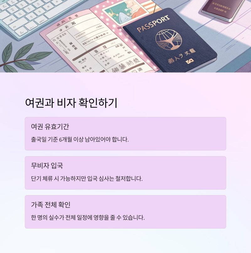 일본은 단기 체류 시 무비자 입국이 가능하지만, 입국 심사에서 거절당하는 일이 없도록 여권 상태도 꼼꼼히 살펴보아야 합니다. 가족 구성원이 많을수록 한 명의 실수가 전체 일정에 영향을 줄 수 있어 주의가 필요합니다.