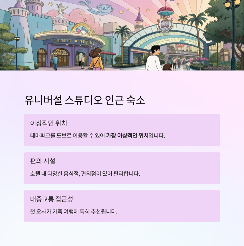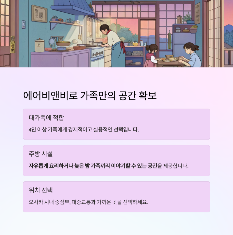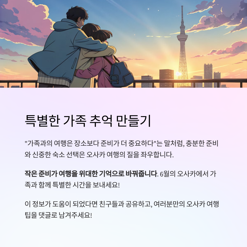 "가족과의 여행은 장소보다 준비가 더 중요하다"는 말처럼, 충분한 준비와 신중한 숙소 선택은 오사카 여행의 질을 좌우합니다.