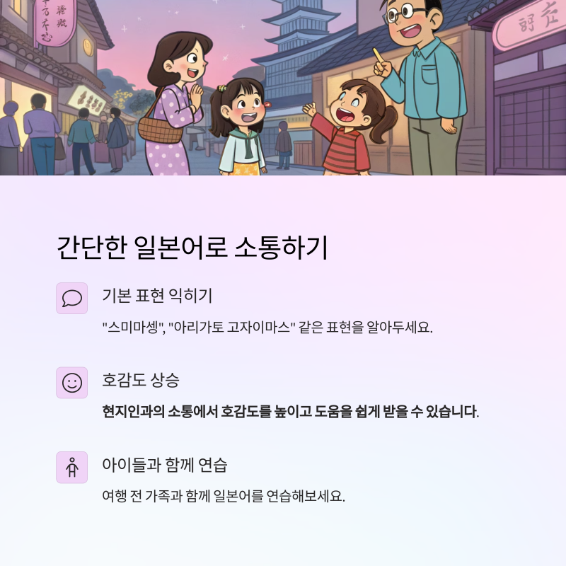 "스미마셍(실례합니다)", "아리가토 고자이마스(감사합니다)"와 같은 표현만 알아도 현지인과의 소통에서 호감도를 높이고 도움을 쉽게 받을 수 있습니다.